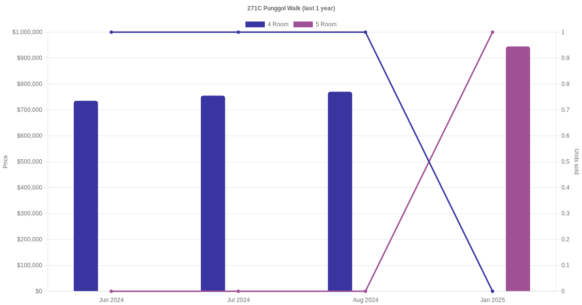 Below is a quick summary of the resale transactions volume and average price trends for the 4 room and 5 room units at 271C Punggol Walk.