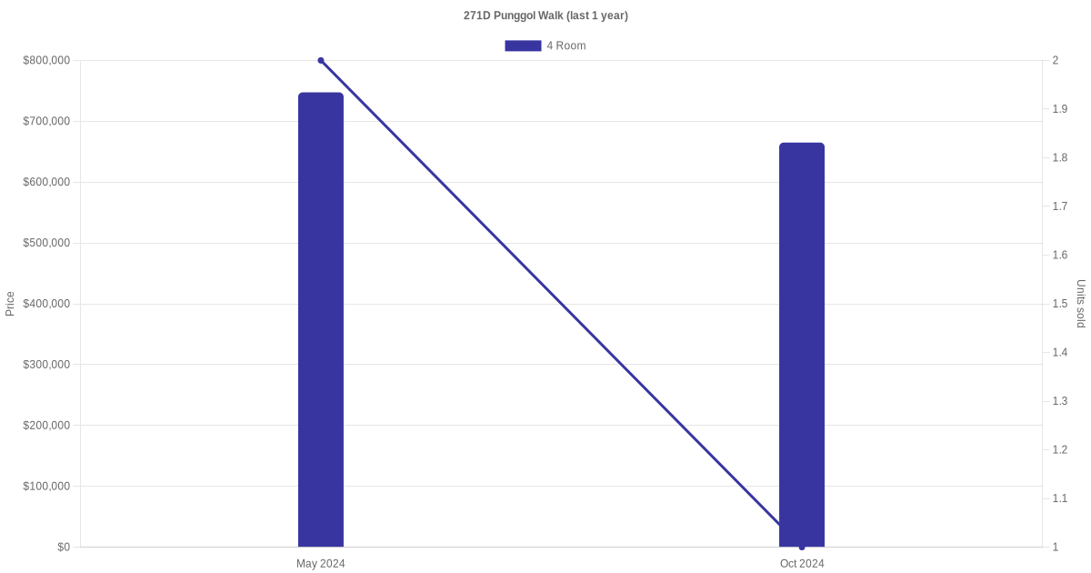 Below is a quick summary of the resale transactions volume and average price trends for the 4 room units at 271D Punggol Walk.
