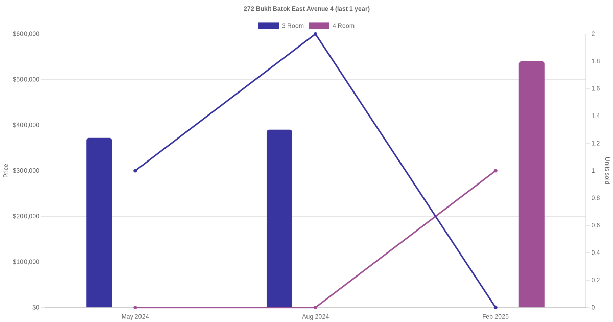 Below is a quick summary of the resale transactions volume and average price trends for the 3 room and 4 room units at 272 Bukit Batok East Avenue 4.