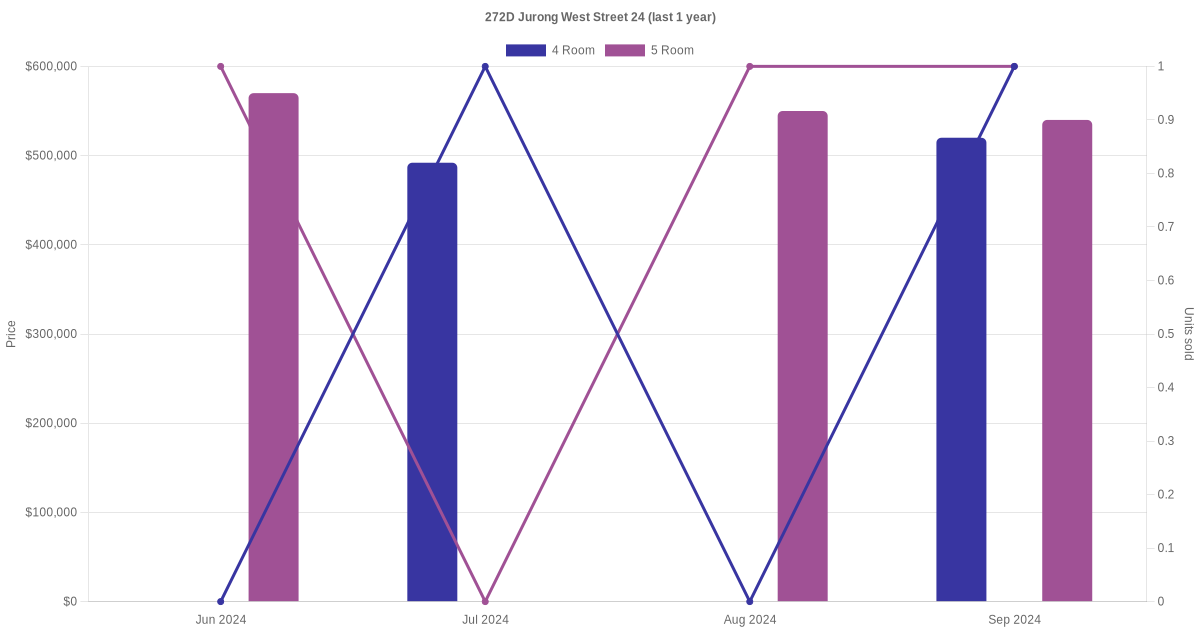 There were a total of 8 resale transactions in the last 3 years for units in block 272D Jurong West Street 24, with the latest one recorded in Sep 2024.