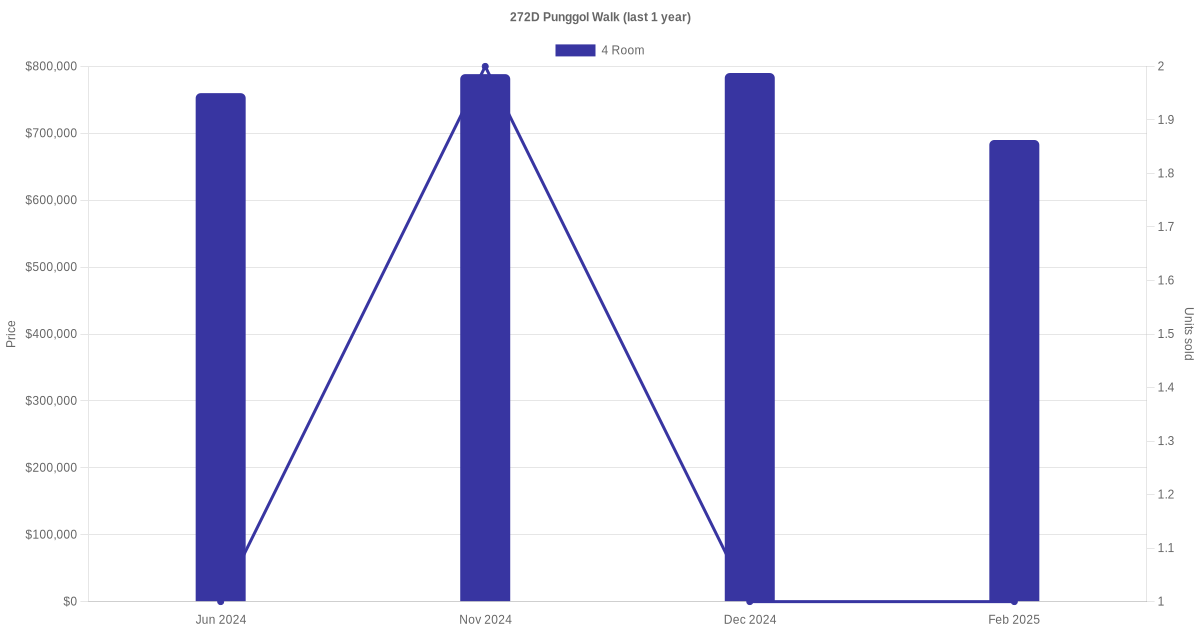 Below is a quick summary of the resale transactions volume and average price trends for the 4 room units at 272D Punggol Walk.