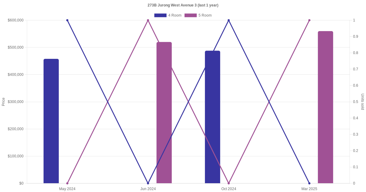 Below is a quick summary of the resale transactions volume and average price trends for the 4 room and 5 room units at 273B Jurong West Avenue 3.