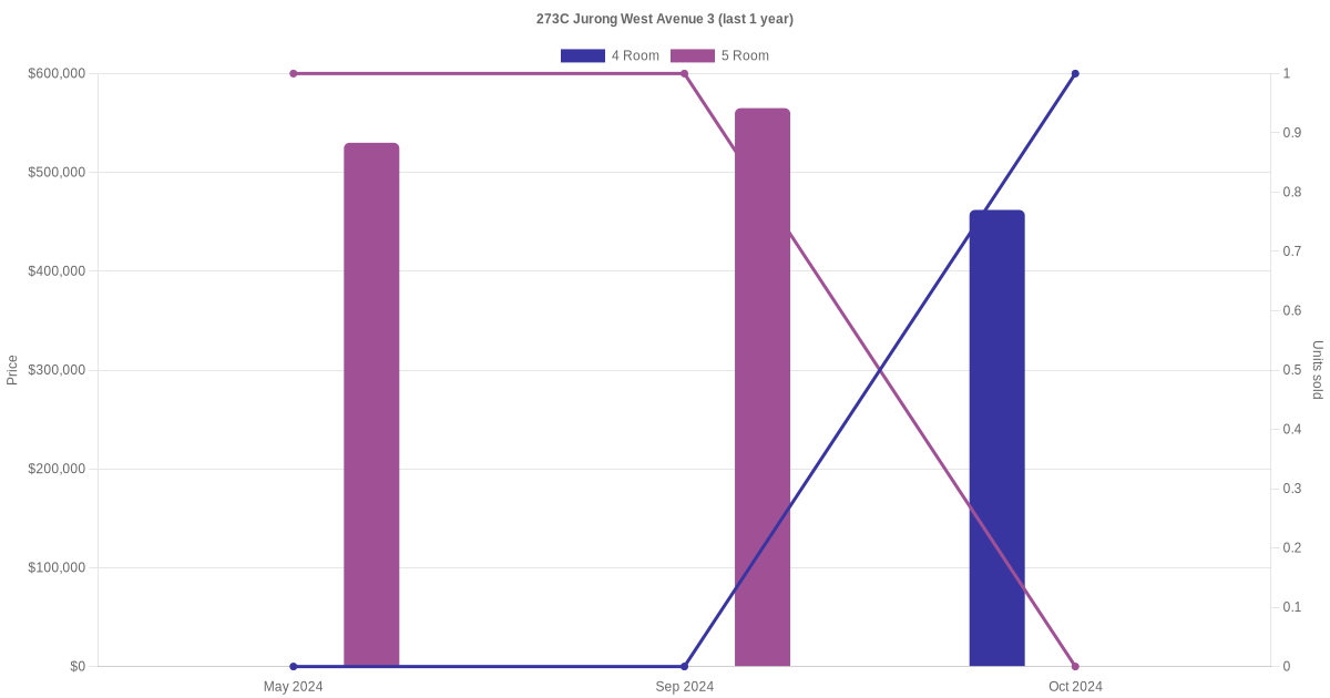 Below is a quick summary of the resale transactions volume and average price trends for the 4 room and 5 room units at 273C Jurong West Avenue 3.
