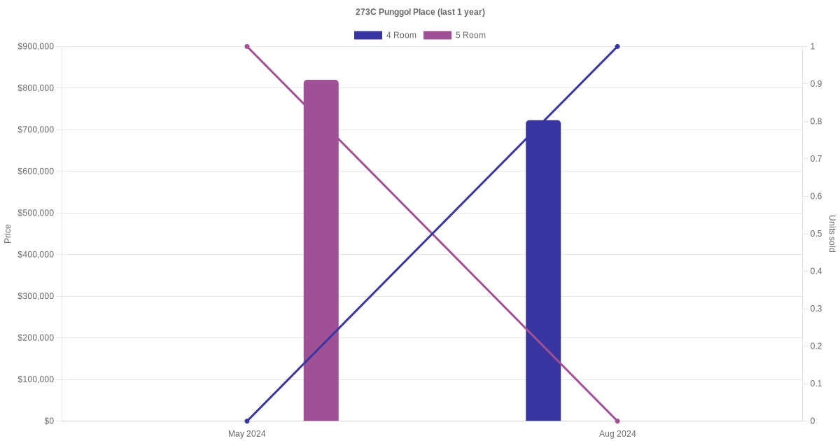 Below is a quick summary of the resale transactions volume and average price trends for the 4 room and 5 room units at 273C Punggol Place.