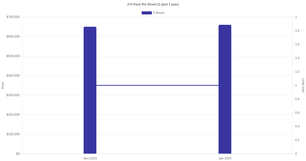 Below is a quick summary of the resale transactions volume and average price trends for the 4 room and 5 room units at 274 Pasir Ris Street 21.