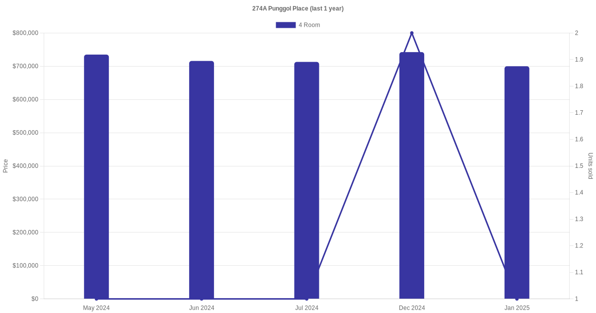 Below is a quick summary of the resale transactions volume and average price trends for the 4 room units at 274A Punggol Place.