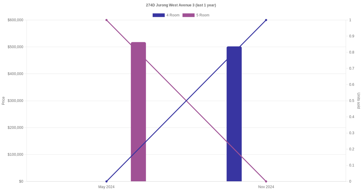 Below is a quick summary of the resale transactions volume and average price trends for the 4 room and 5 room units at 274D Jurong West Avenue 3.