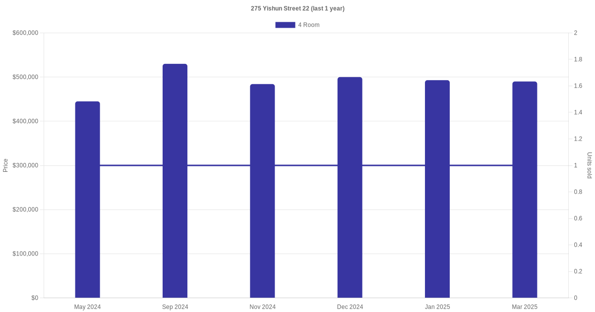 Below is a quick summary of the resale transactions volume and average price trends for the 4 room units at 275 Yishun Street 22.