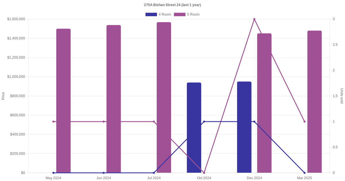 Below is a quick summary of the resale transactions volume and average price trends for the 4 room and 5 room units at 275A Bishan Street 24.