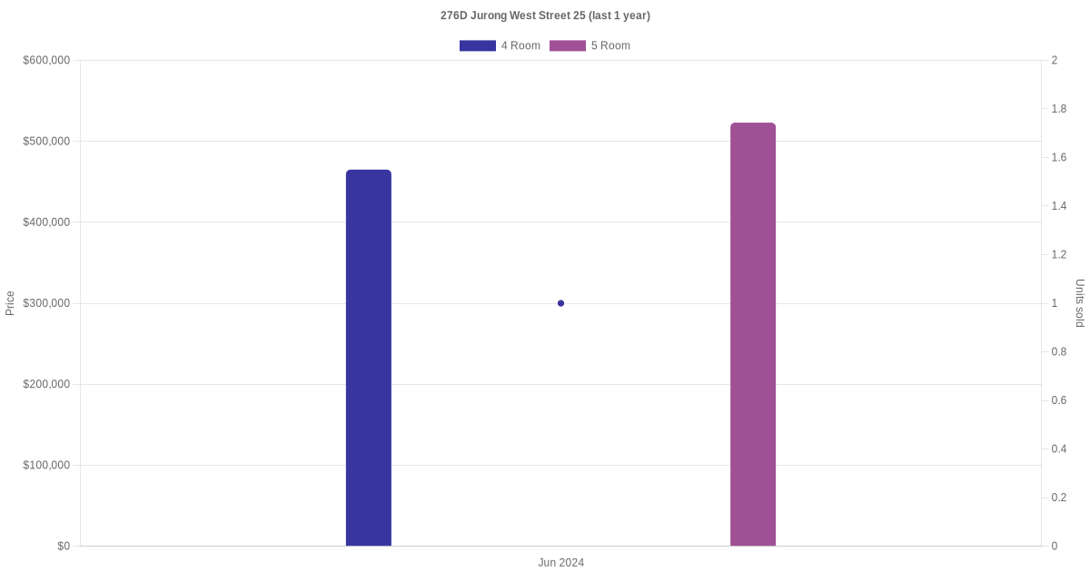 Below is a quick summary of the resale transactions volume and average price trends for the 4 room and 5 room units at 276D Jurong West Street 25.