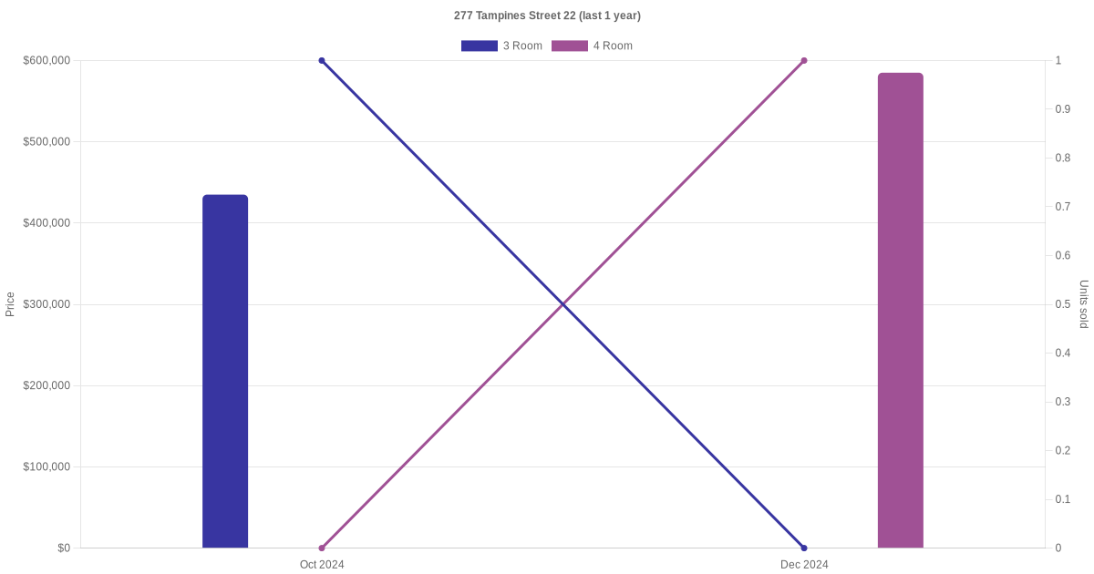 Below is a quick summary of the resale transactions volume and average price trends for the 3 room and 4 room units at 277 Tampines Street 22.