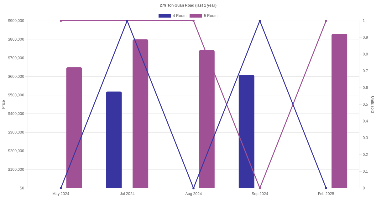 Below is a quick summary of the resale transactions volume and average price trends for the 4 room and 5 room units at 279 Toh Guan Road.