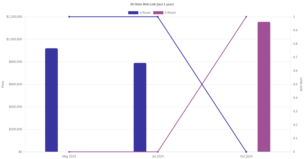 Below is a quick summary of the resale transactions volume and average price trends for the 4 room and 5 room units at 28 Ghim Moh Link.