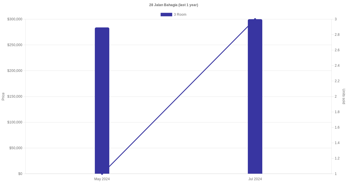 Below is a quick summary of the resale transactions volume and average price trends for the 3 room units at 28 Jalan Bahagia.
