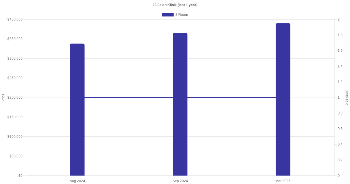 Below is a quick summary of the resale transactions volume and average price trends for the 2 room and 3 room units at 28 Jalan Klinik.