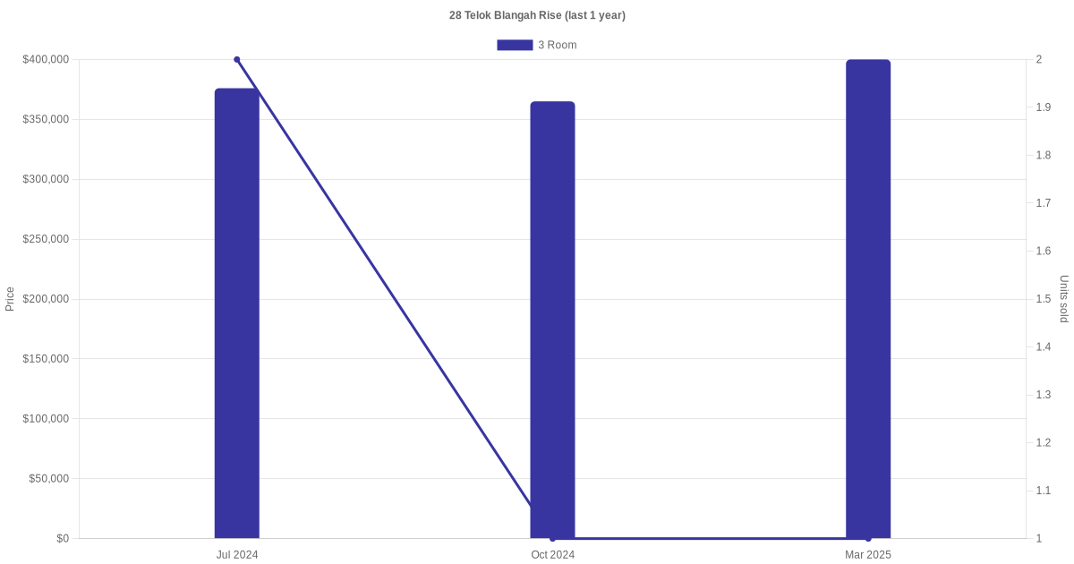 Below is a quick summary of the resale transactions volume and average price trends for the 3 room units at 28 Telok Blangah Rise.