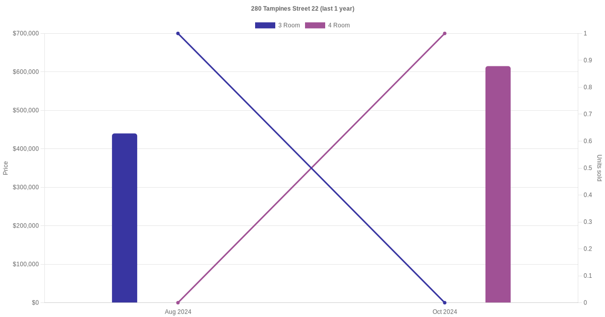 Below is a quick summary of the resale transactions volume and average price trends for the 3 room and 4 room units at 280 Tampines Street 22.