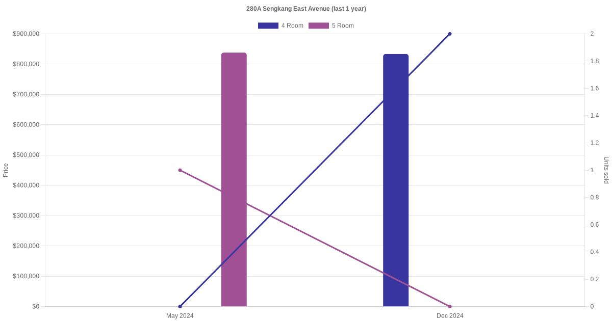 Below is a quick summary of the resale transactions volume and average price trends for the 4 room and 5 room units at 280A Sengkang East Avenue.