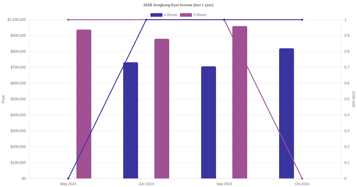 Below is a quick summary of the resale transactions volume and average price trends for the 4 room and 5 room units at 282B Sengkang East Avenue.