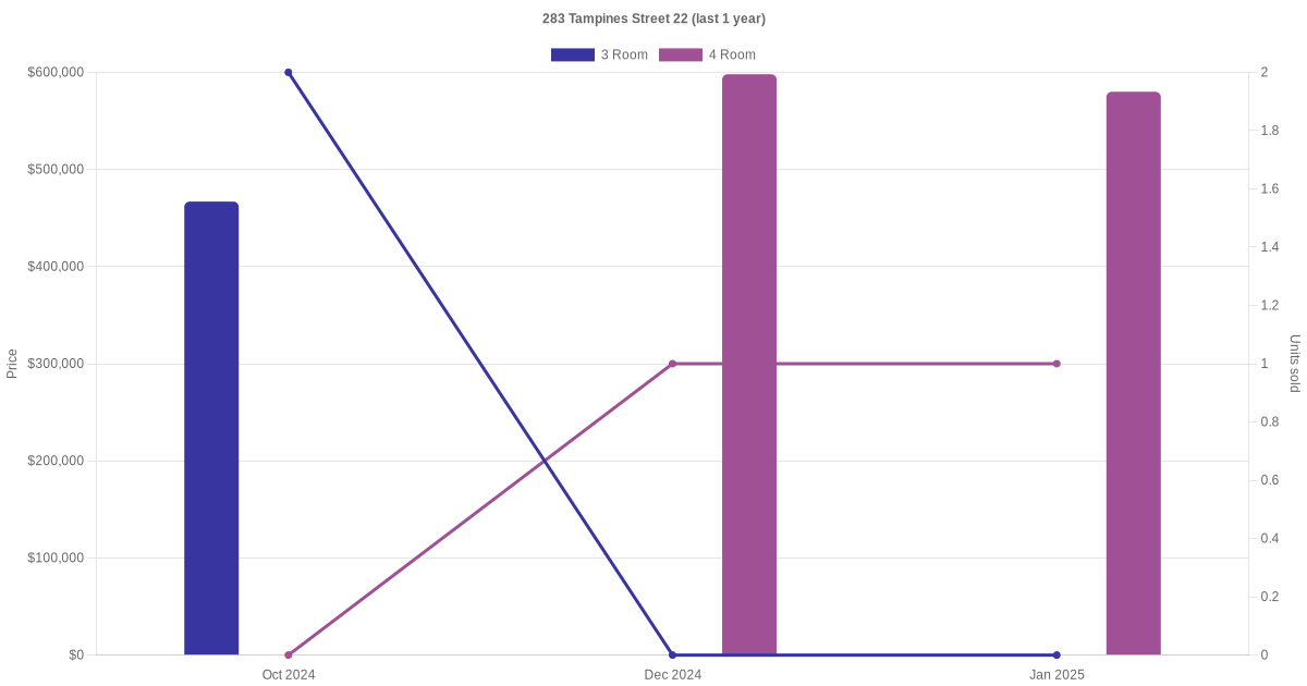 Below is a quick summary of the resale transactions volume and average price trends for the 3 room and 4 room units at 283 Tampines Street 22.