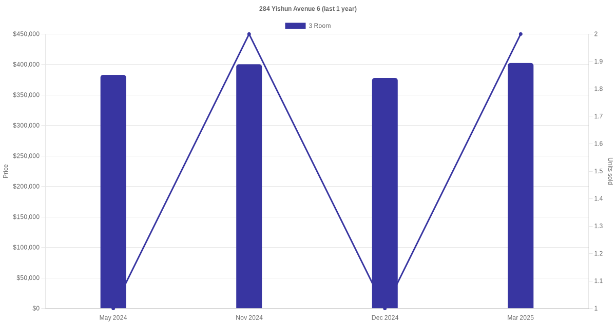 Below is a quick summary of the resale transactions volume and average price trends for the 3 room and 4 room units at 284 Yishun Avenue 6.