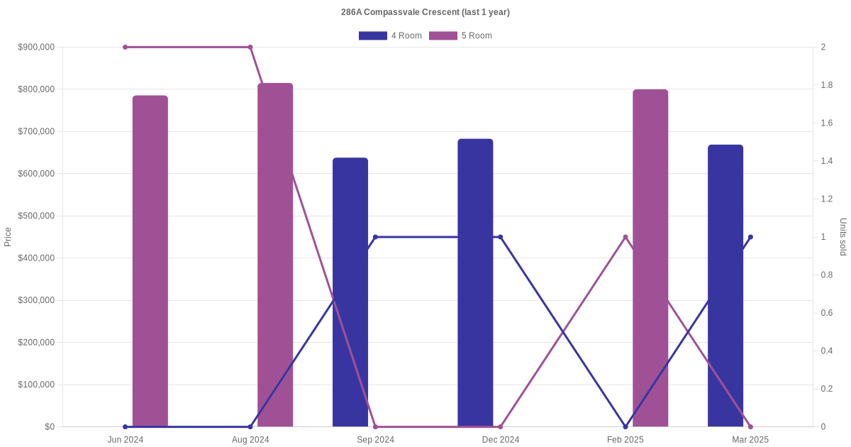 Below is a quick summary of the resale transactions volume and average price trends for the 4 room and 5 room units at 286A Compassvale Crescent.