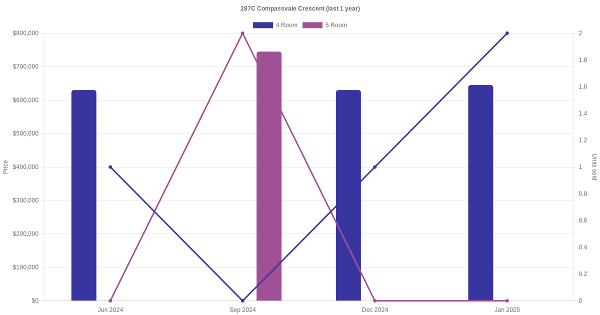 Below is a quick summary of the resale transactions volume and average price trends for the 4 room and 5 room units at 287C Compassvale Crescent.