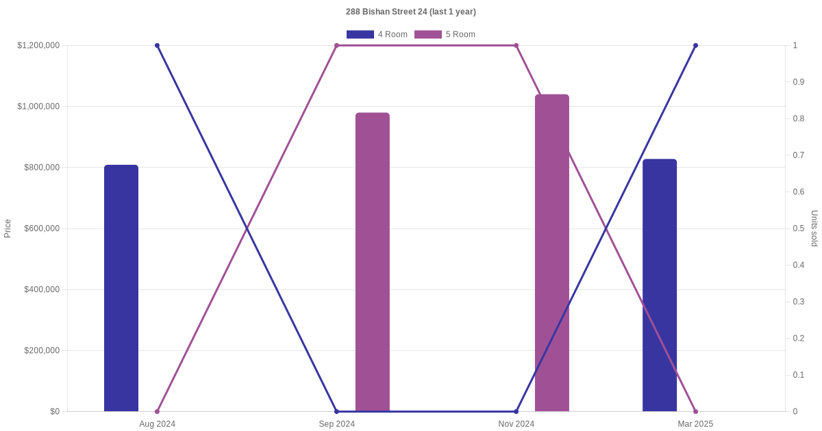 Below is a quick summary of the resale transactions volume and average price trends for the 4 room and 5 room units at 288 Bishan Street 24.