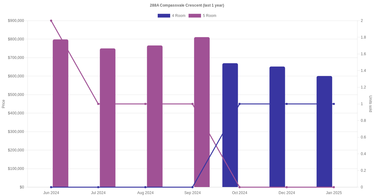 Below is a quick summary of the resale transactions volume and average price trends for the 4 room and 5 room units at 288A Compassvale Crescent.