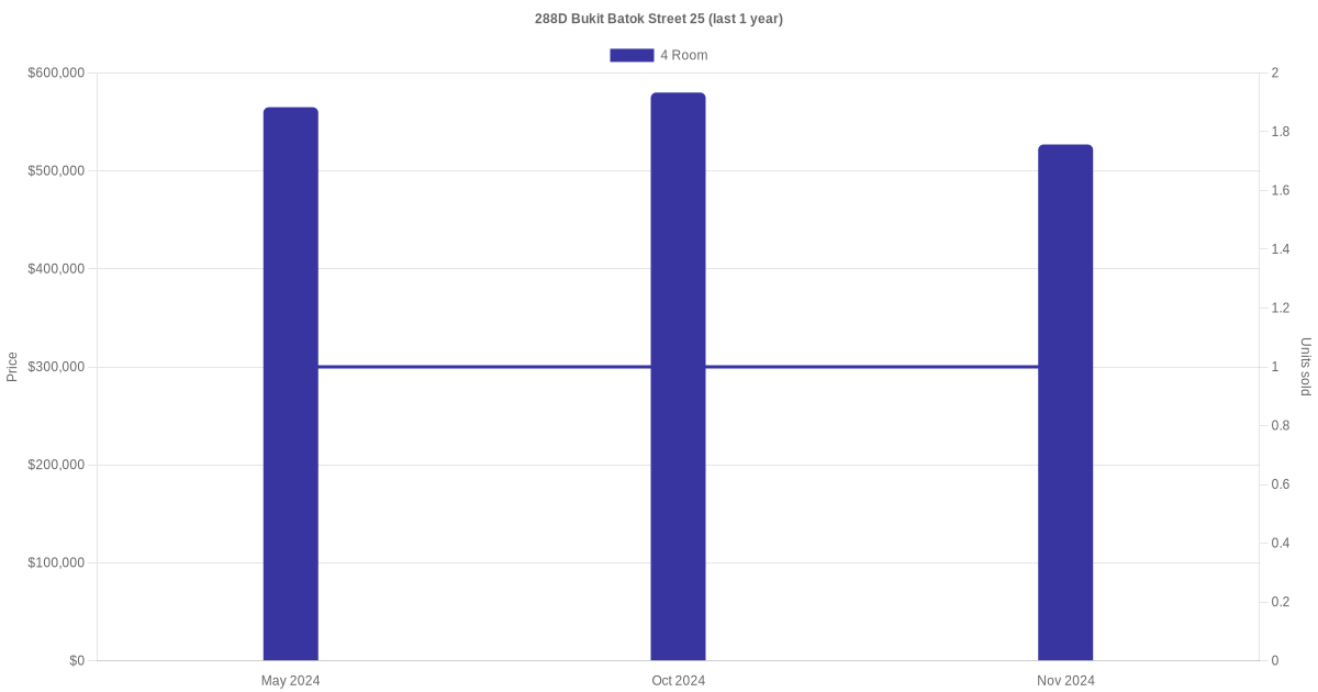 Below is a quick summary of the resale transactions volume and average price trends for the 4 room units at 288D Bukit Batok Street 25.