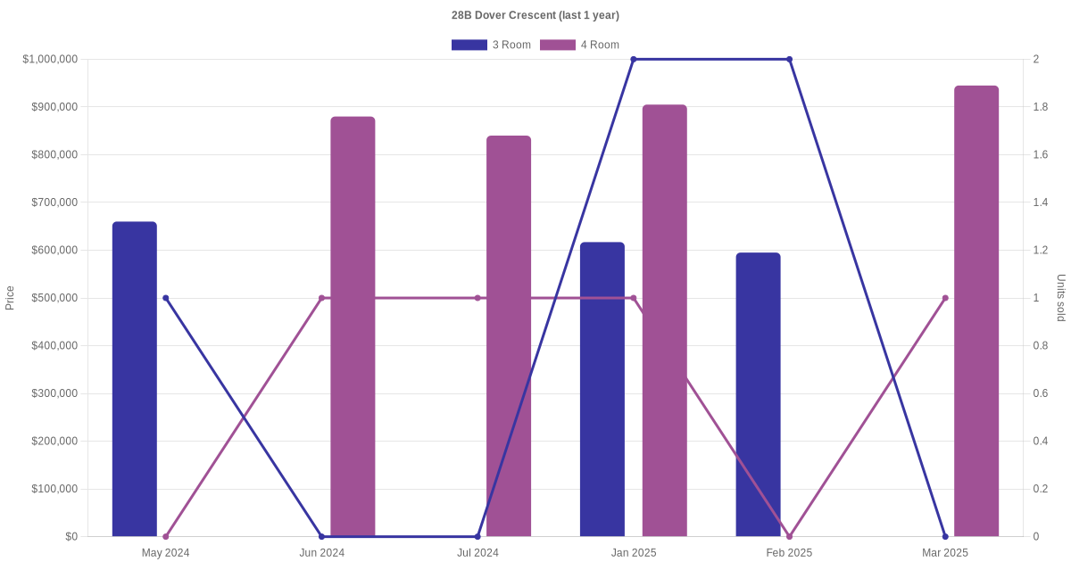 Below is a quick summary of the resale transactions volume and average price trends for the 3 room and 4 room units at 28B Dover Crescent.