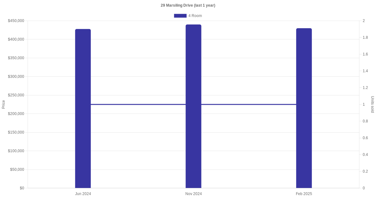 Below is a quick summary of the resale transactions volume and average price trends for the 4 room units at 29 Marsiling Drive.