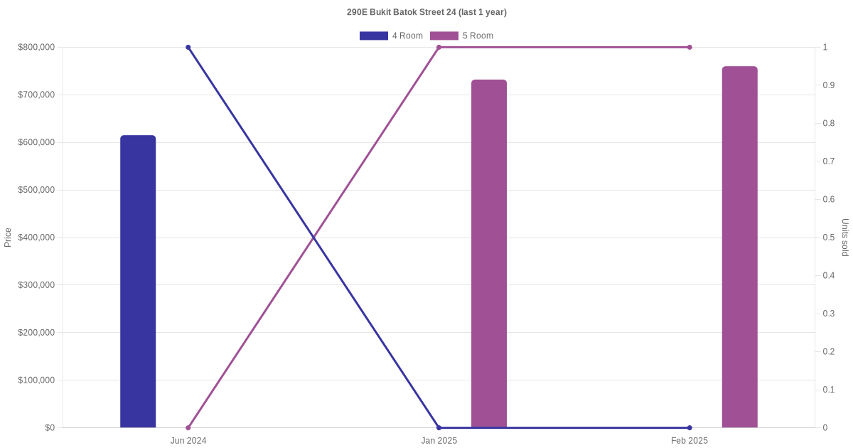 Below is a quick summary of the resale transactions volume and average price trends for the 4 room and 5 room units at 290E Bukit Batok Street 24.