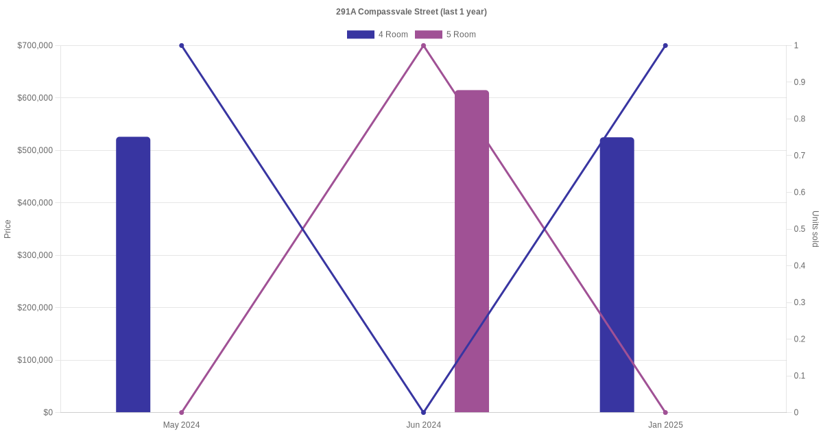 Below is a quick summary of the resale transactions volume and average price trends for the 4 room and 5 room units at 291A Compassvale Street.
