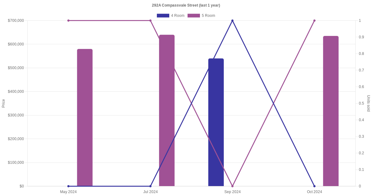 Below is a quick summary of the resale transactions volume and average price trends for the 4 room and 5 room units at 292A Compassvale Street.