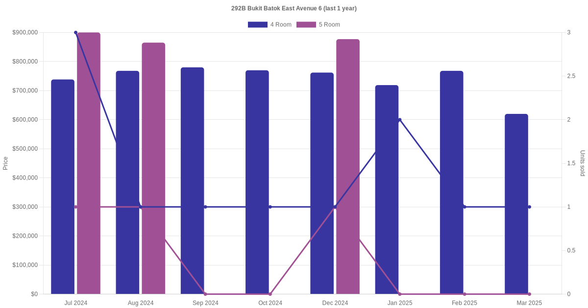 Below is a quick summary of the resale transactions volume and average price trends for the 4 room and 5 room units at 292B Bukit Batok East Avenue 6.
