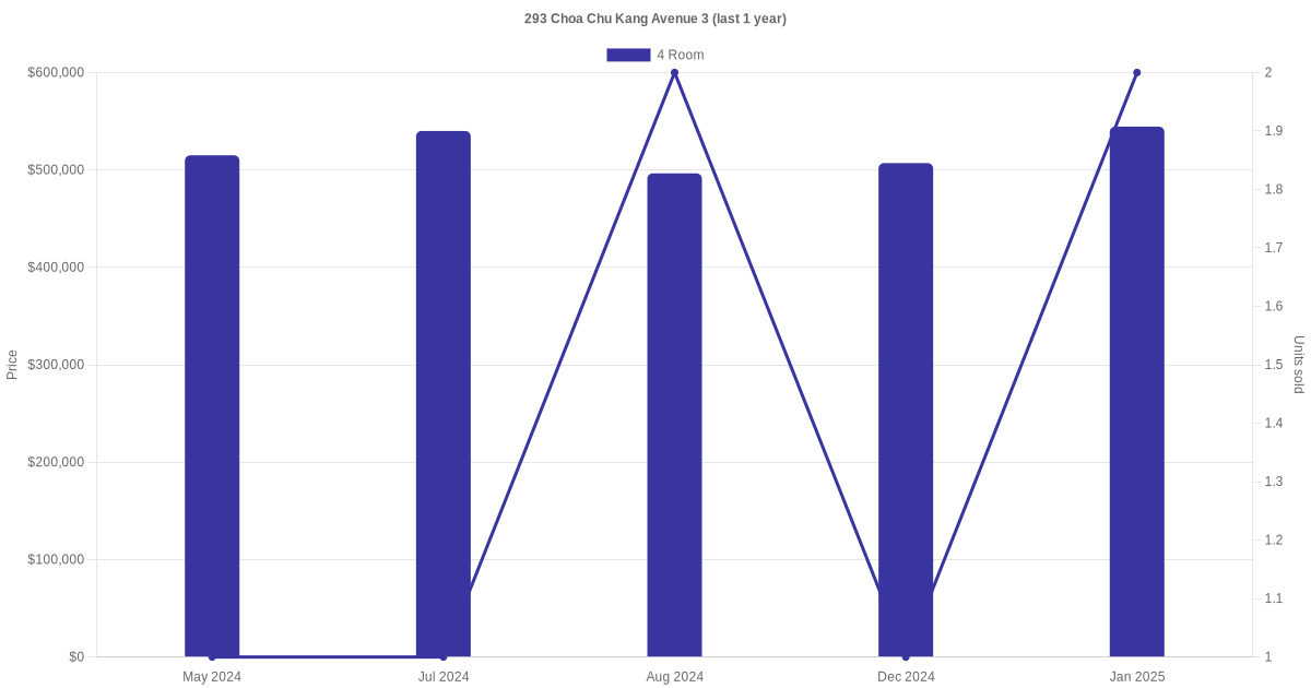 Below is a quick summary of the resale transactions volume and average price trends for the 4 room units at 293 Choa Chu Kang Avenue 3.