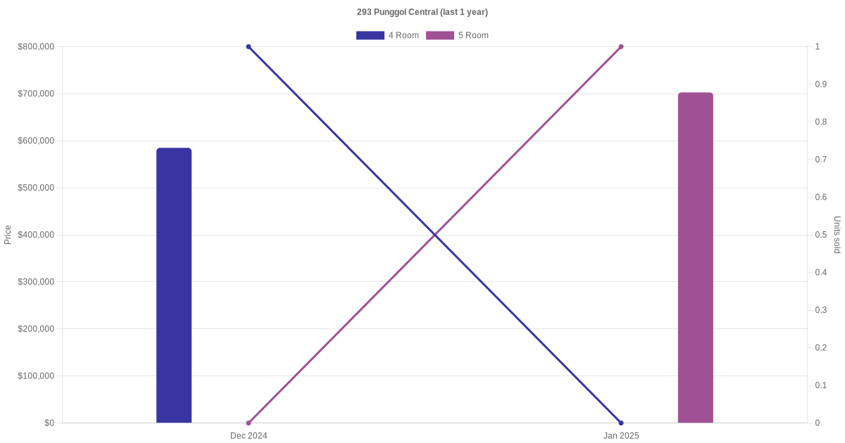 Below is a quick summary of the resale transactions volume and average price trends for the 4 room and 5 room units at 293 Punggol Central.