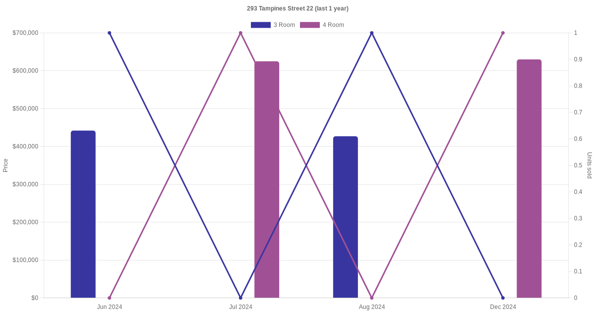 Below is a quick summary of the resale transactions volume and average price trends for the 3 room and 4 room units at 293 Tampines Street 22.