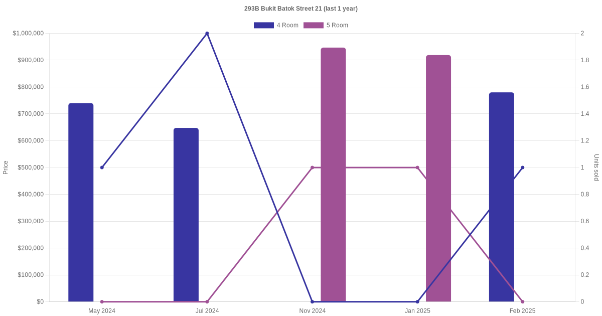 Below is a quick summary of the resale transactions volume and average price trends for the 4 room and 5 room units at 293B Bukit Batok Street 21.