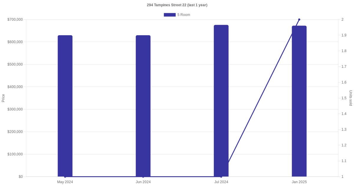 Below is a quick summary of the resale transactions volume and average price trends for the 5 room units at 294 Tampines Street 22.
