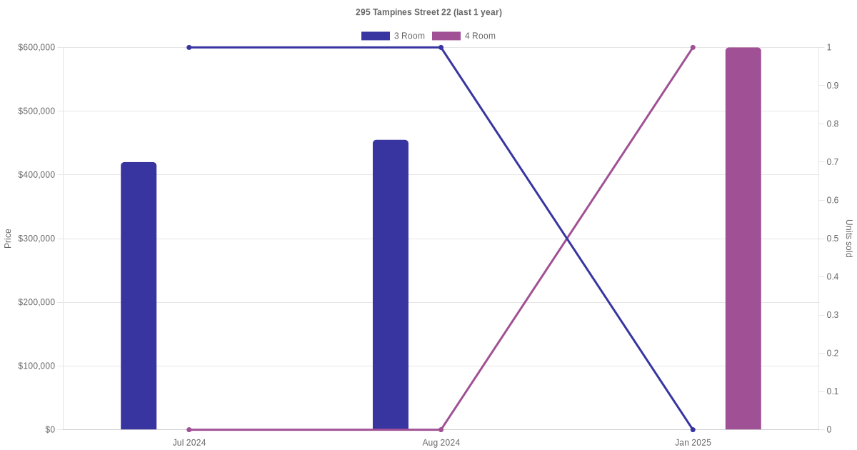 Below is a quick summary of the resale transactions volume and average price trends for the 3 room and 4 room units at 295 Tampines Street 22.