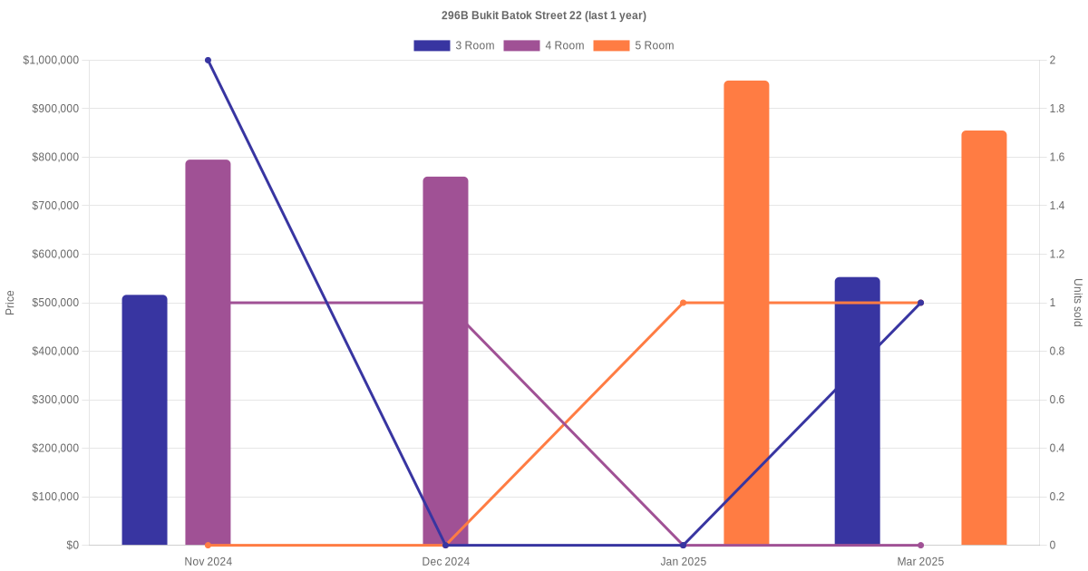 Below is a quick summary of the resale transactions volume and average price trends for the 3 room, 4 room and 5 room units at 296B Bukit Batok Street 22.