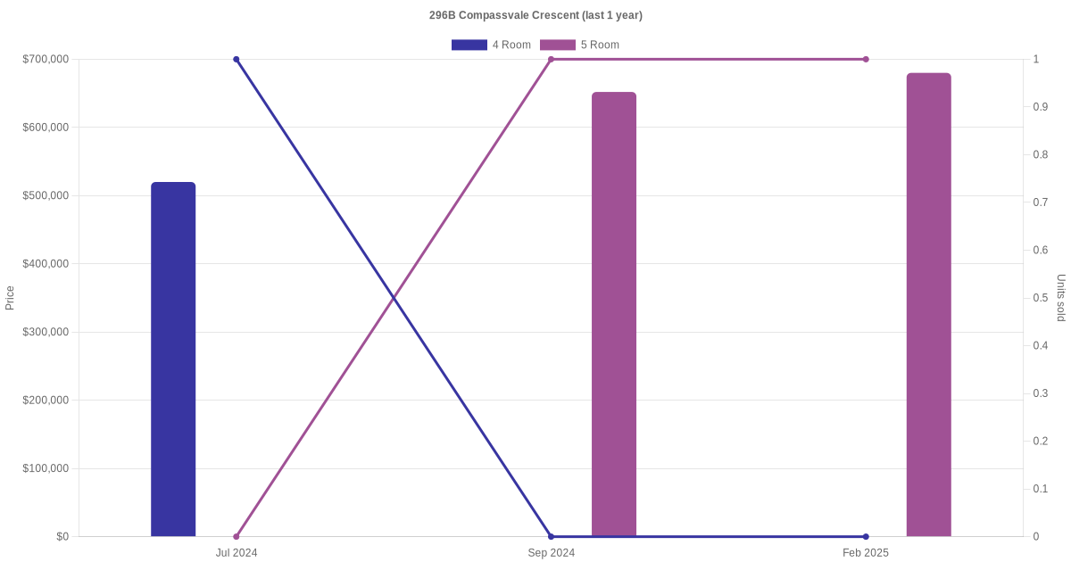 Below is a quick summary of the resale transactions volume and average price trends for the 4 room and 5 room units at 296B Compassvale Crescent.