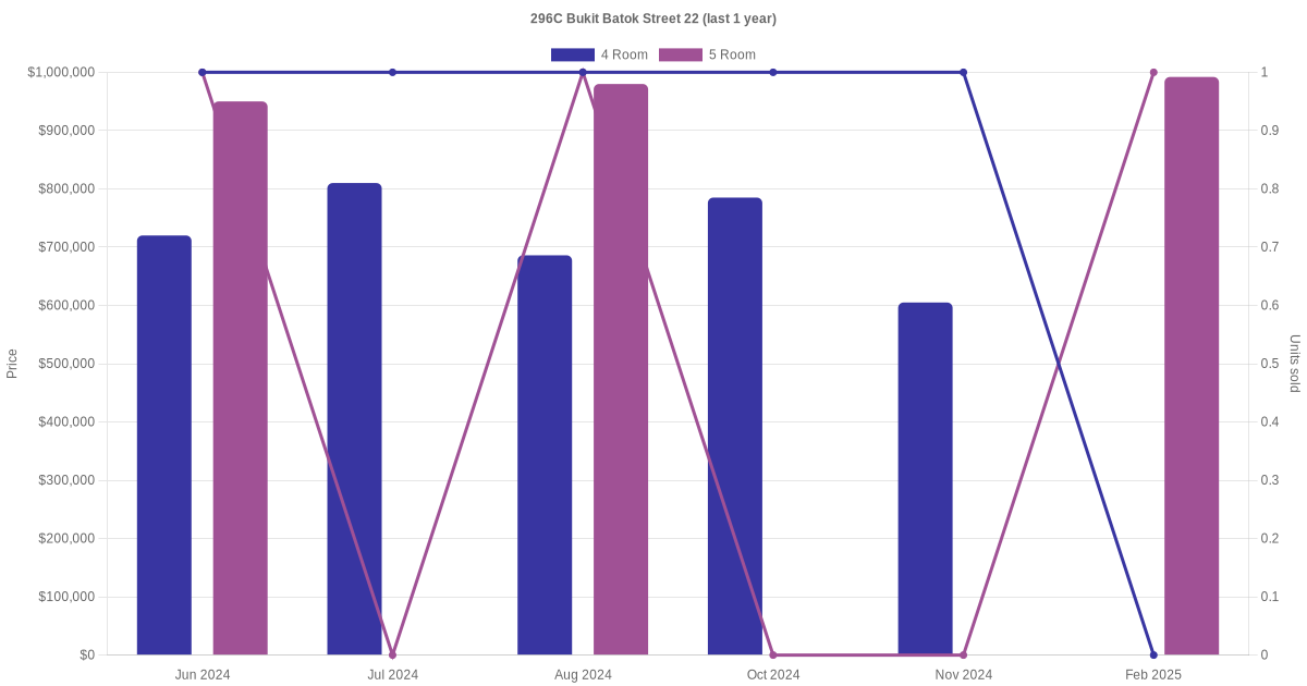 Below is a quick summary of the resale transactions volume and average price trends for the 4 room and 5 room units at 296C Bukit Batok Street 22.