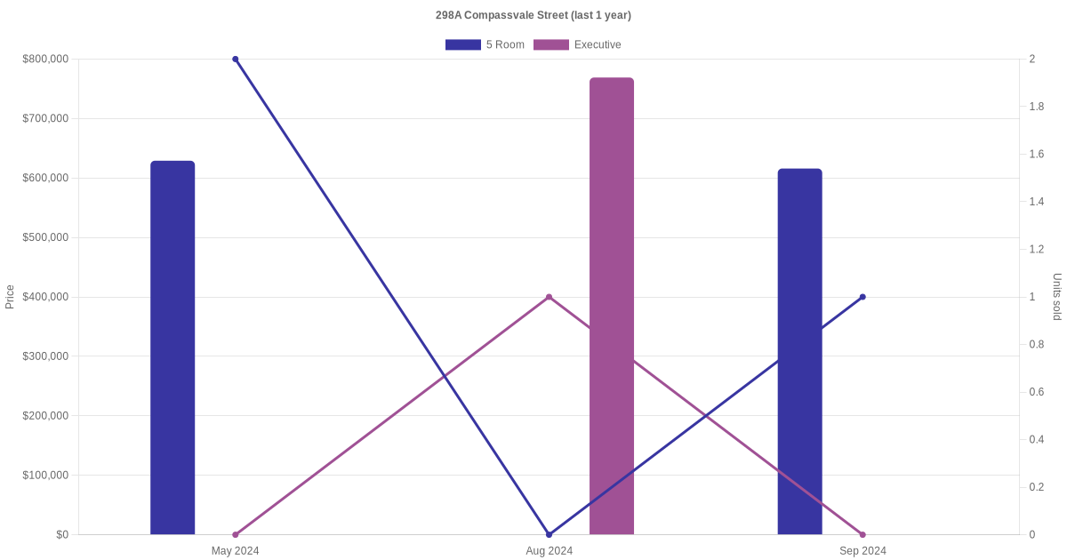 Below is a quick summary of the resale transactions volume and average price trends for the 4 room, 5 room and executive units at 298A Compassvale Street.