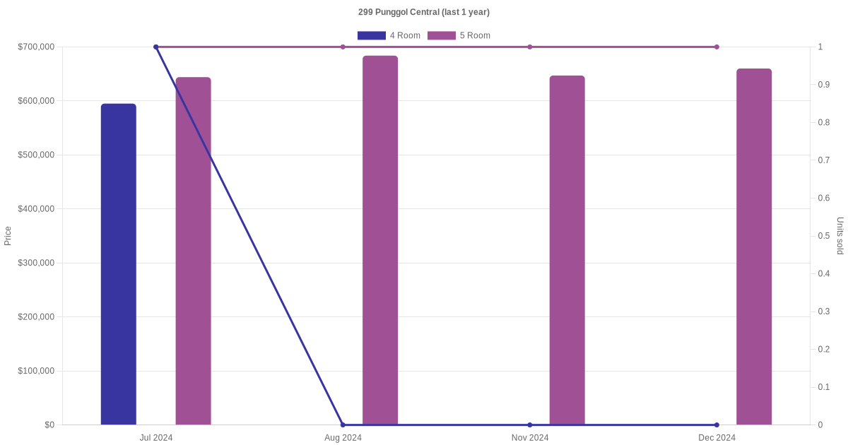 Below is a quick summary of the resale transactions volume and average price trends for the 4 room and 5 room units at 299 Punggol Central.