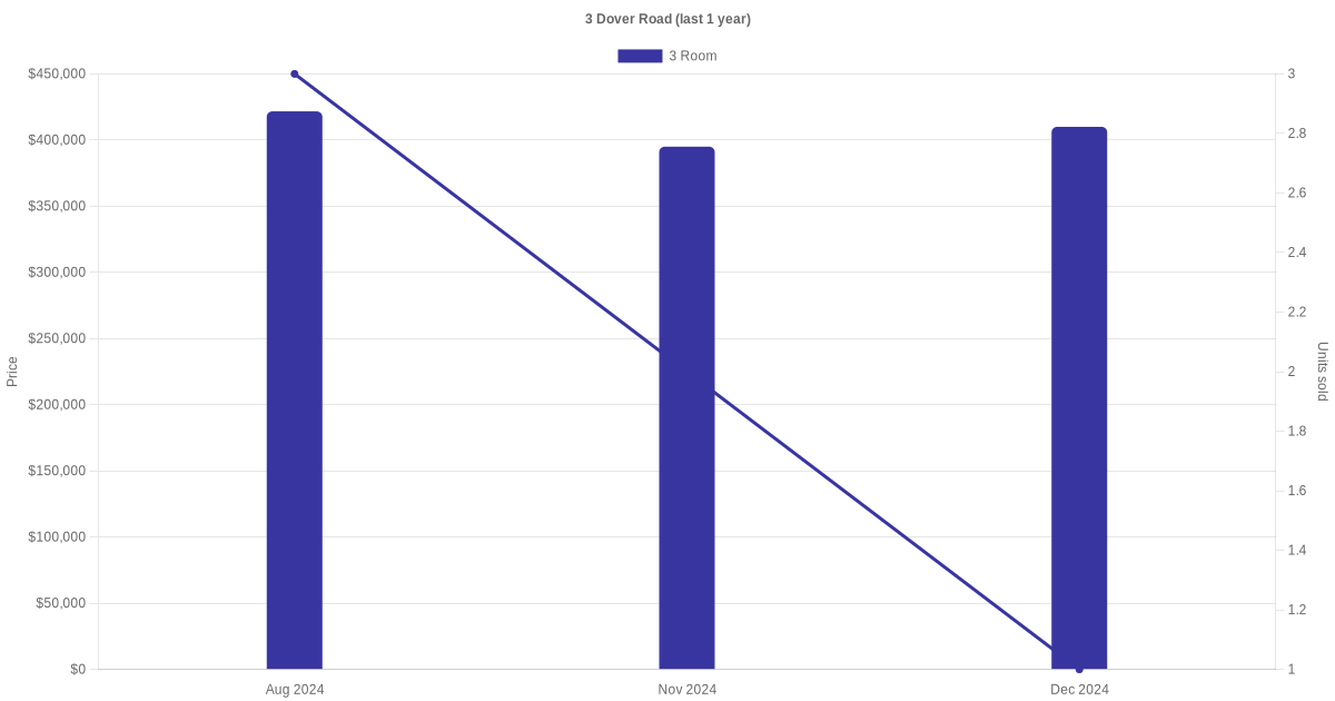 Below is a quick summary of the resale transactions volume and average price trends for the 3 room units at 3 Dover Road.