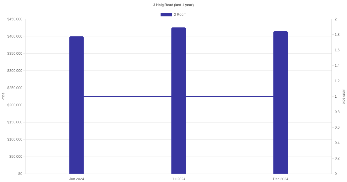 Below is a quick summary of the resale transactions volume and average price trends for the 3 room units at 3 Haig Road.