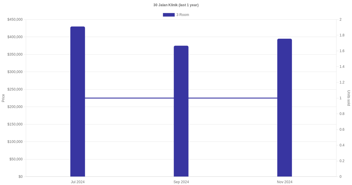 There were a total of 9 resale transactions in the last 3 years for units in block 30 Jalan Klinik, with the latest one recorded in Nov 2025.